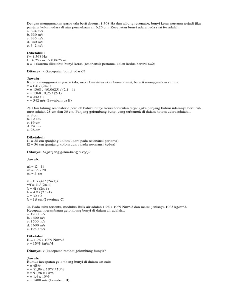 Sebuah kolom udara memiliki panjang 40 cm. Sebuah pipa organ yang ditutup pada salah satu ujungnya, memiliki panjang 17 cm. Cepat rambat udara di dalam tabung tersebut adalah…. Jika garpu tala mempunyai frekuensi 320 hz, maka besarnya cepat rambat gelombang bunyi di udara pada saat terjadi resonansi pertama adalah.m/s. Dalam rumus cepat rambat bunyi juga dikenal sebagai istilah resonansi yang tidak lain ialah kondisi ikut bergetarnya suatu benda yang di akibatkan oleh.